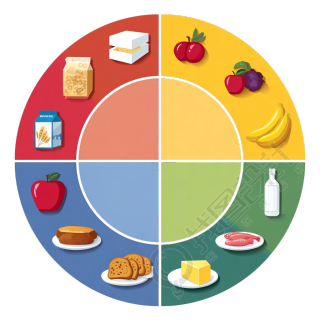 这是一个色彩丰富的圆形图形,展示了食物金字塔被分为两部分,一部分有食物,另一部分没有。左侧包含水果、蔬菜、全谷类、豆类、鱼类等。PNG格式,透明背景,高清,商业设计元素,插画设计。