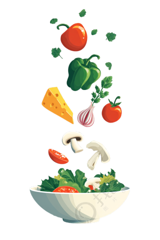 这是一组透明背景、高清质量的素材,展示了蔬菜飞入白色碗中的创意设计。图形素材适用于商业设计,包含丰富的设计元素,可商用。