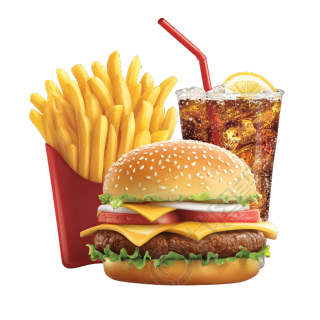 这是一组高清透明背景的快餐套餐插图素材,包括汉堡、薯条和饮料,适合商业设计和创意设计。