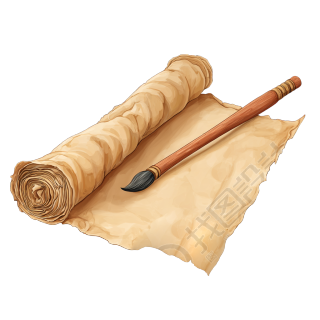 这是一张透明背景、高清的传统中国纸卷与画笔PNG图形素材,适用于商业设计、创意设计等用途。