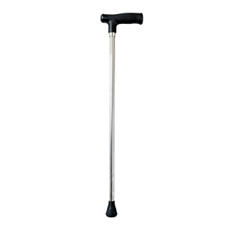 这是一个逼真的黑色行走拐杖,带有T字形手柄,银色金属装饰,光滑质地,透明背景高清PNG图形素材,适用于商业设计创意元素。