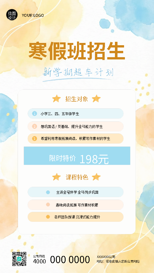 寒假班招生宣传水彩卡通风手机海报
